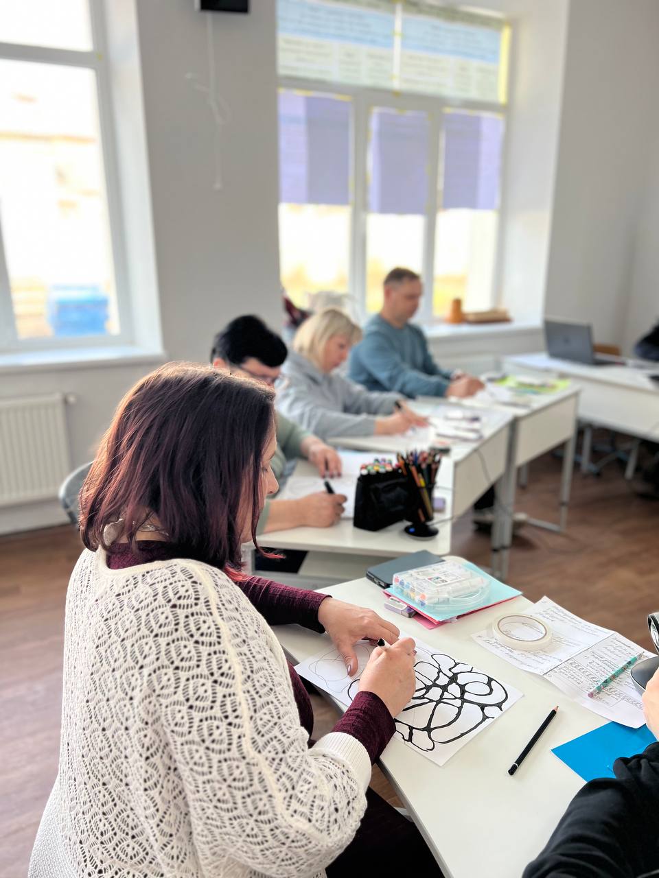 26 березня в Жмеринському ліцеї № 5 відбулася креативна сесія вчителів мистецтва у змішаному форматі на тему: “Мистецтво як мова: створюємо спільний меседж”. До заходу також приєдналися колеги з Дружківської громади, що розширило коло професійного спілкування та обміну досвідом. Основна творча група працювала очно в закладі, тоді як інші учасники долучилися дистанційно.Головною спікеркою стала вчителька