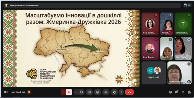 1 квітня відбулася онлайн-зустріч працівників дошкільної освіти Жмеринської міської та Дружківської громад. Це черговий крок у межах реалізації національного проєкту «Пліч-о-пліч: згуртовані громади». Координатор зустрічі, консультант КУ «Центр професійного розвитку педагогічних працівників» Алла Шамрай, відкриваючи захід, наголосила на стратегічній важливості такої співпраці: «Реалізуючи проєкт “Пліч-о-пліч”, ми доводимо: освіта не має кордонів. Наша взаємна професійна підтримка